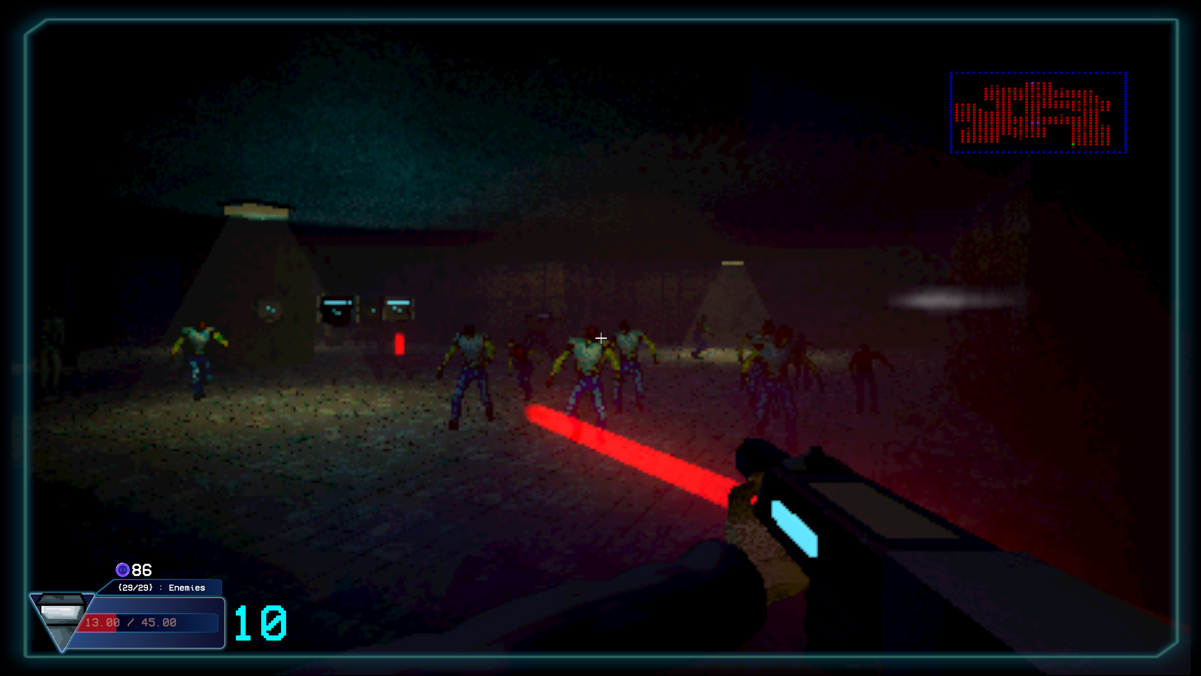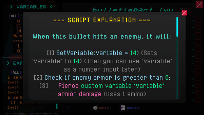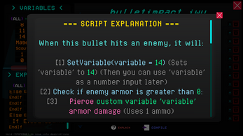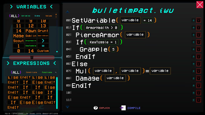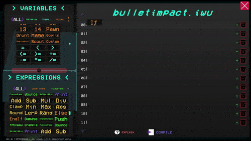 This isn't your typical zombie shooter. Fight through waves of enemies, collect coins, and spend them in your terminal to buy chunks of code. Then piece them together to build your own custom bullet behavior. Your bullets run the script when they hit something, so you can grab enemies, change their speed, teleport them, and a whole lot more. Experiment with the coding system, which will walk you through what your code does and tell you if what you created has syntax issues!